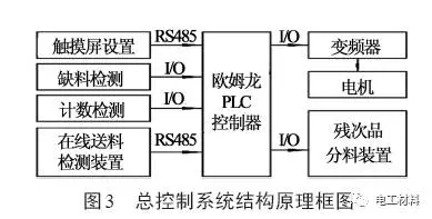 控制系统的硬件部分主要由PLC、触摸屏、变 频器、丝材在线检测系统、丝材缺料检测传感器和 残次品分离装置组成。PLC 选用欧姆龙CP1L 系 列,CPU 型号为CP1L-EL20TD-D,此模块自带12 入/8 出的数字信号接口,2 路8 位模拟输入信号,考 虑到PLC与变频器的速度控制及显示问题,增加一 个PLC模拟输出模块,将PLC中数字化的电机速度 通过模拟输出模块输入到变频器的模拟输入模块, 同时将变频器的速度模拟输出信号接到CPU 自带 的模拟量输入接口,实现触摸屏速度显示。丝材在 线检测系统使用高精度编码器实现,RS485 通讯接 口串行输出。丝材缺料检测传感器使用电感式接 近开关,DC 0~24 V直流开关量信号输出。触摸屏 使用步科MT4230T,RS485 通讯接口与PLC 结合。 变频器选用型号为EM303A的2.2 kW正弦变频器, 其模拟输出信号DC 0~10 V接到PLC 模拟输入接 口。其总控制系统结构原理图如图3所示。