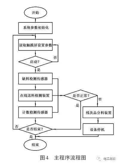 控制系统的软件设计包括PLC程序设计[4]和触 摸屏页面程序设计[5]。PLC主程序主要包括系统参 数初始化、缺料检测停机设计、在线送料检测传感 器信号采集设计、计数控制停机设计、残次品分料 控制设计、接受触摸屏参数设置及输出控制变频器 信号设计。主程序流程图如图4所示。 触摸屏的程序设计主要是人机交互的界面,设 计当前铆钉型电触头生产数、铆钉型电触头最大生产数、电机制钉转速显示等。此外,需要设计能够实现触摸屏控制冷镦机的运行及停止,根据不同材料及不同的铆钉型电触头规格设置相应的冷镦速度,形成冷镦工艺参数库;在生产前调取所需的冷镦工艺,进行生产的自动化控制。